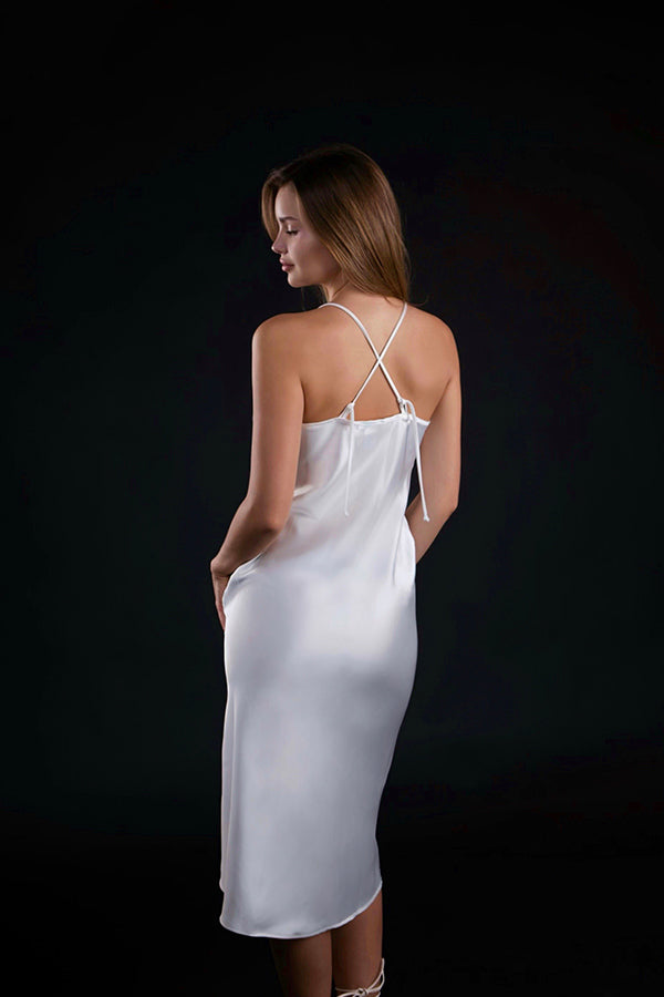 Stunning satin “Pearl” dress which will define the feminine beauty.With cross over cami straps in the back and side split.