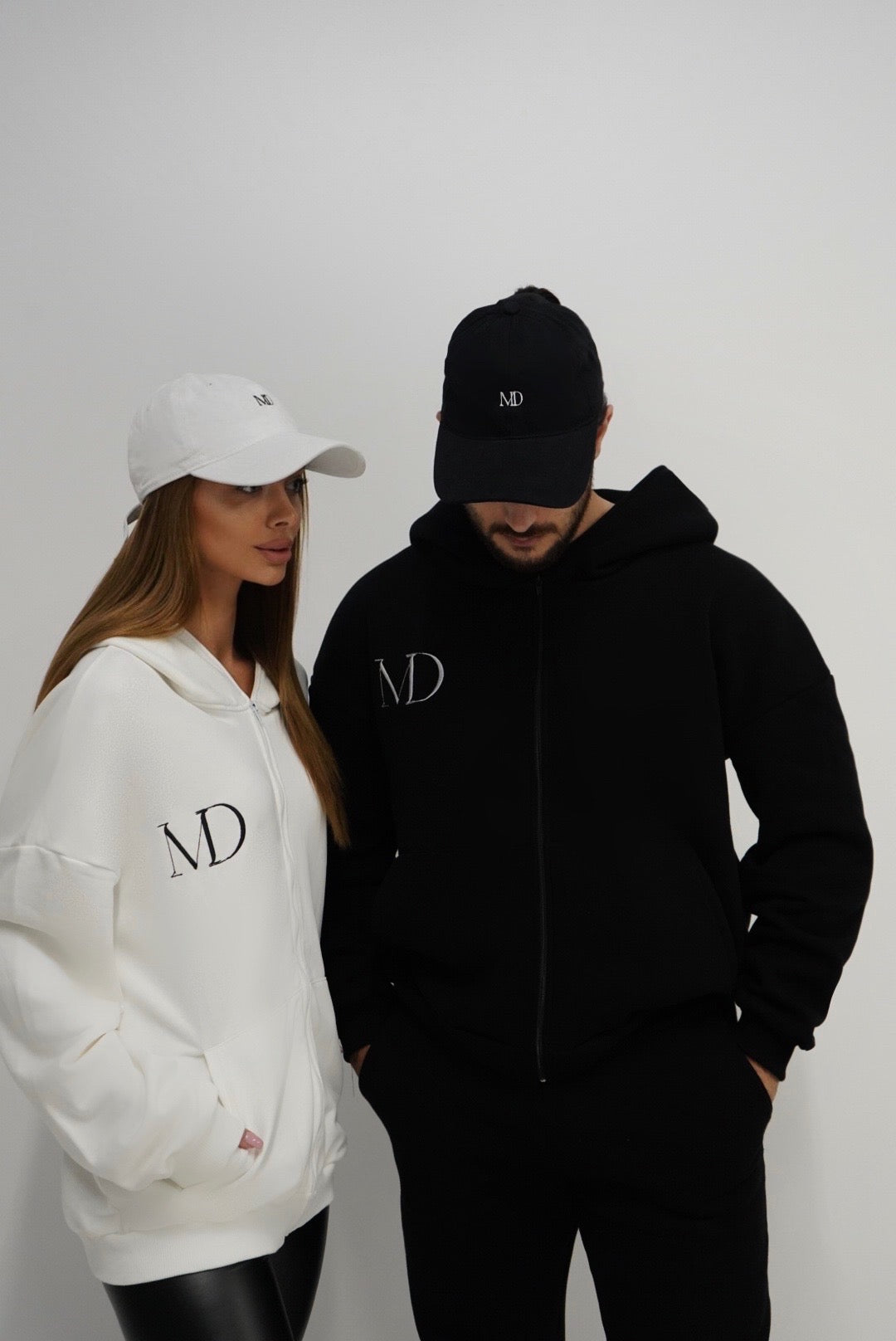 Our signature styled “LA MADIEN” zip-up hoodie is a perfect for layering featuring a front zipper closure and a hood, providing both comfort and style in white color.