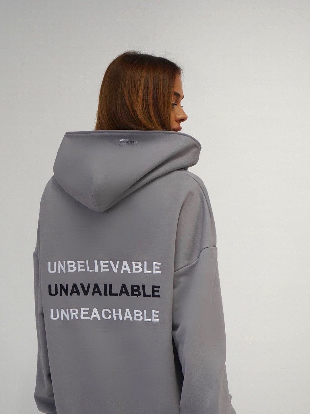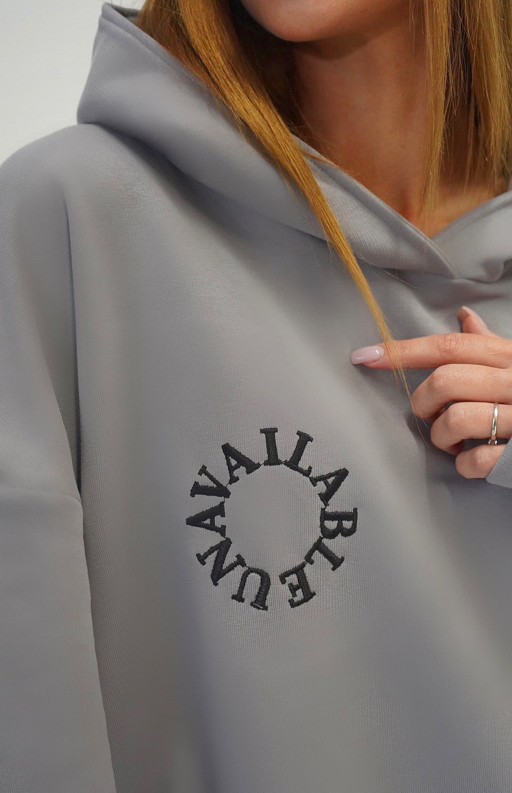 Our signature styled "UNAVAILABLE" cozy and soft hoodie for women in grey color with black and white embroidery. Its oversized fit ensures maximum comfort and style.